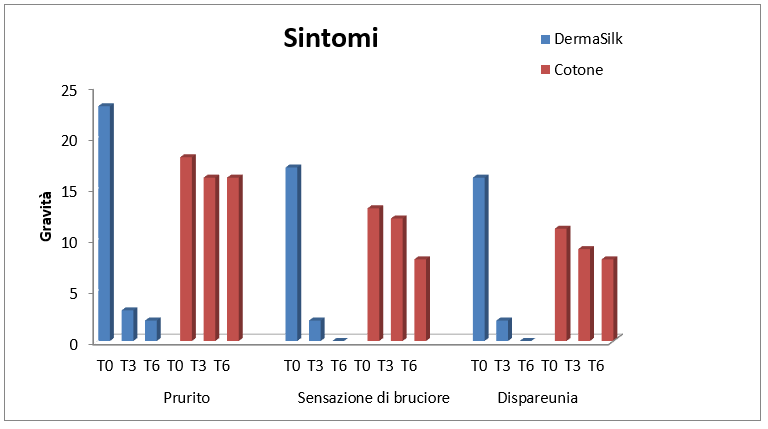 Alle visite di follow-up, dopo 3 e 6 mesi, tutti i sintomi e i segni obiettivi hanno dimostrato un miglioramento statisticamente significativo di DermaSilk a confronto con il gruppo Cotone (p<0.001). In particolare nel gruppo DermaSilk è stata registrata una diminuzione drastica della severità dei sintomi e segni clinici già al primo controllo dopo 3 mesi. Solo nel gruppo DermaSilk si è registrata una riduzione statisticamente significativa delle ricadute, di cui il 60% delle pazienti ha riportato nessuna o una ricaduta (Totale 24 ricadute nel gruppo DermaSilk vs 68 ricadute nel gruppo cotone, p<0.001).