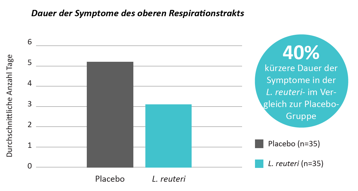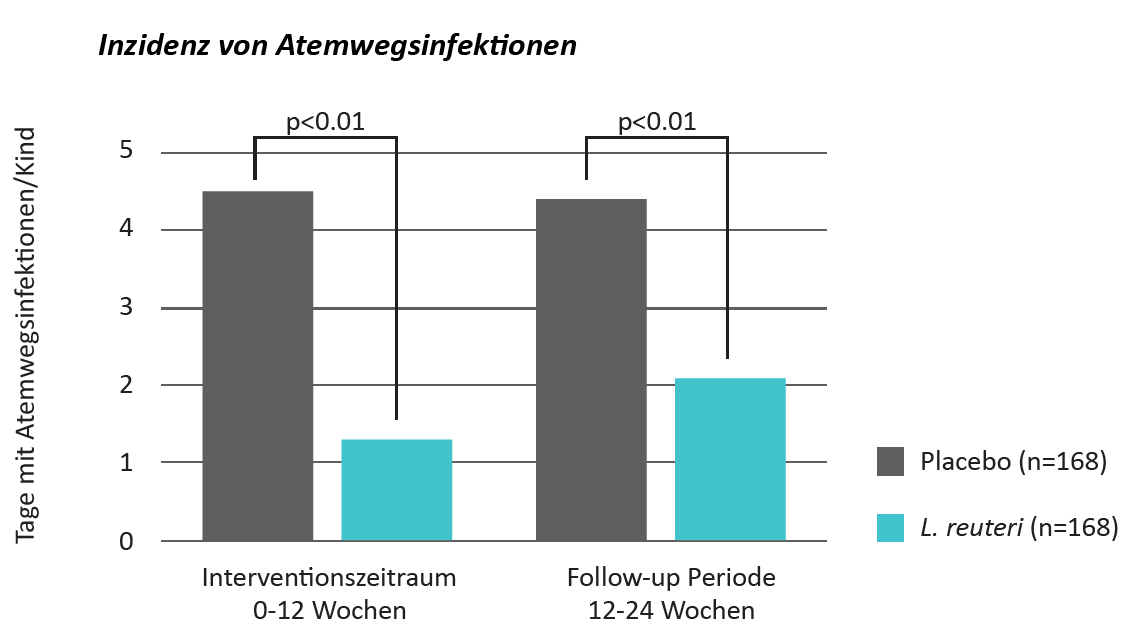 Die Kinder erhielten drei Monate lang täglich fünf Tropfen (1x108 KBE) L. reuteri DSM 17938 (n=168) oder ein Placebo (n=168), gefolgt von drei Monaten ohne Supplementierung. Die Autoren kamen zum Schluss, dass die Einnahme von L. reuteri DSM 17938 zu einer Verringerung der Episoden, der Dauer und des Schweregrads von Atemwegsinfektionen (wie in Grafik abgebildet), Durchfall und Antibiotikaeinsatz führte.