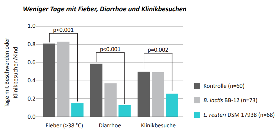 Die Autoren kamen zum Schluss, dass in der L. reuteri DSM 17938-Gruppe im Vergleich zur BB-12- oder Kontroll-Gruppe die Anzahl Fiebertage, Klinikbesuche, Abwesenheitstage in der Kinderkrippe, Antibiotikaverschreibungen, Durchfallerkrankungen und die Dauer der Atemwegsinfektionen signifikant kleiner waren.