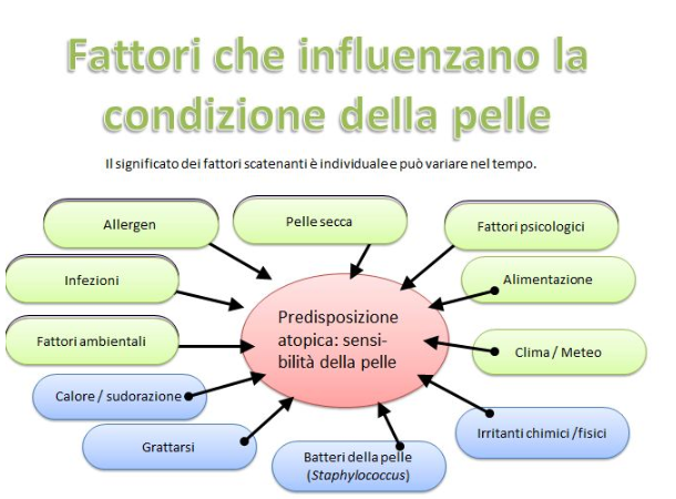 Molte sostanze sono state identificate come fattori scatenanti il prurito e non sono la stessa cosa per ogni persona. Molte volte è difficile individuare l'esatto elemento che provoca una nuova vampata d'eczema. Per alcuni, basta il contatto di materiali con la pelle per provocare prurito. Per altri, il troppo caldo e la conseguente sudorazione può provocare l'insorgere dell'eczema. Per altre persone ancora il contatto con acari della polvere, animali, saponi, detergenti, disinfettanti, abiti irritanti, determinati alimenti può scatenare il prurito. Pure le infezioni delle vie respiratorie superiori (causati da virus) possono attivare l'eczema. Lo stress a volte può anche contribuire alla manifestazione o all'aggravamento dell'eczema.